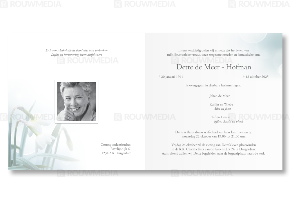 Op deze kaart wordt een wit sneeuwklokje weergegeven, aan de binnenzijde van de kaart kan een portretfoto worden geplaatst met een kader eromheen.
