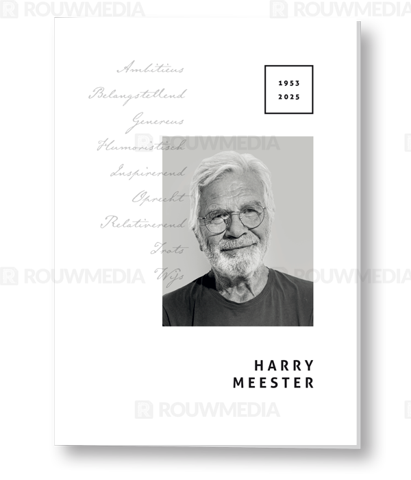 Op deze rouwkaart kan een eigen foto worden weergegeven, ook kunnen er kenmerken/eigenschappen van de overledene worden benoemd.