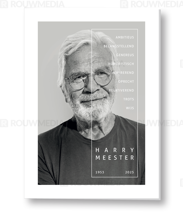 Op deze rouwkaart kan een eigen foto worden weergegeven, ook kunnen er kenmerken/eigenschappen van de overledene worden benoemd.