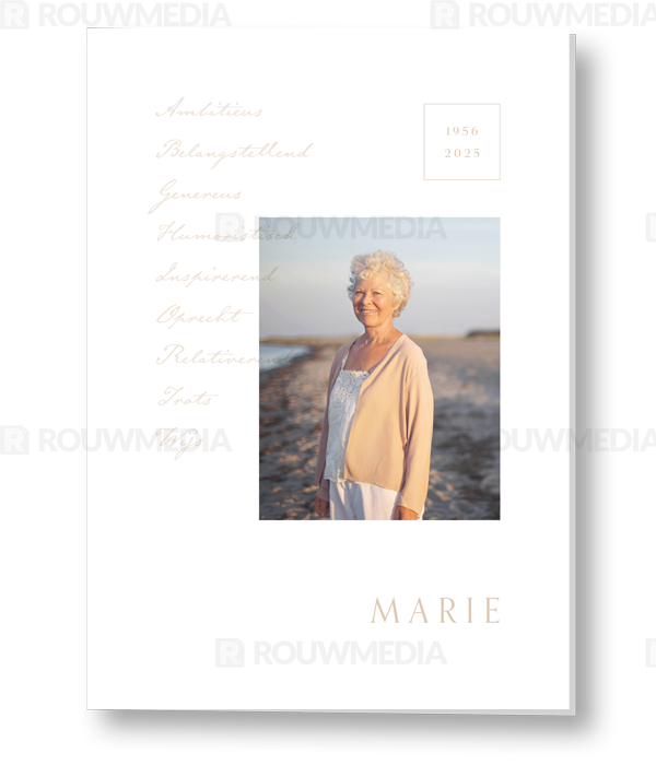 Op deze rouwkaart kan een eigen foto worden weergegeven, ook kunnen er kenmerken/eigenschappen van de overledene worden benoemd.