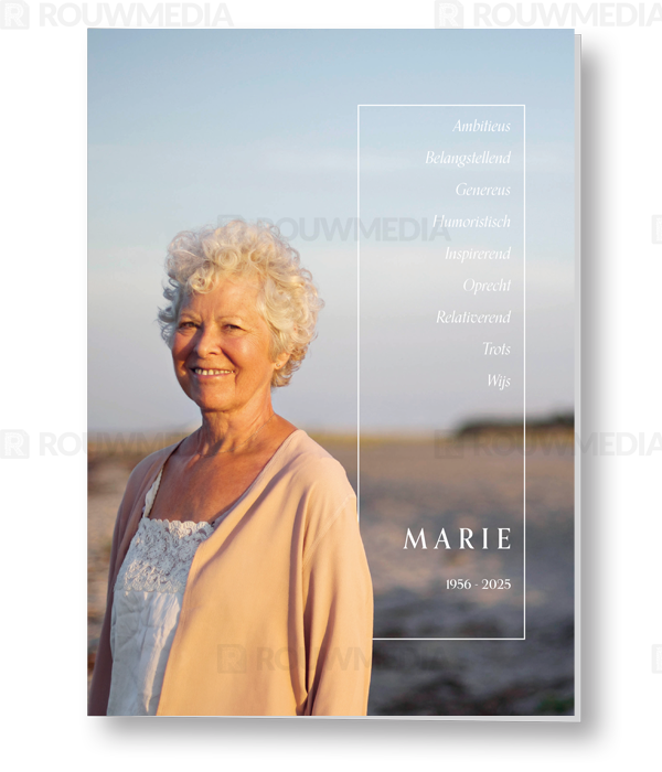 Op deze rouwkaart kan een eigen foto worden weergegeven, ook kunnen er kenmerken/eigenschappen van de overledene worden benoemd.