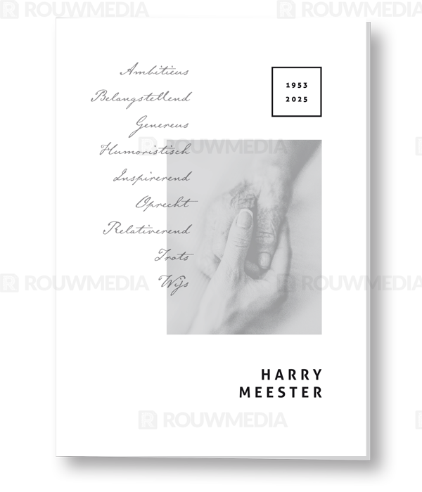 Op deze rouwkaart kan een eigen foto worden weergegeven, ook kunnen er kenmerken/eigenschappen van de overledene worden benoemd.