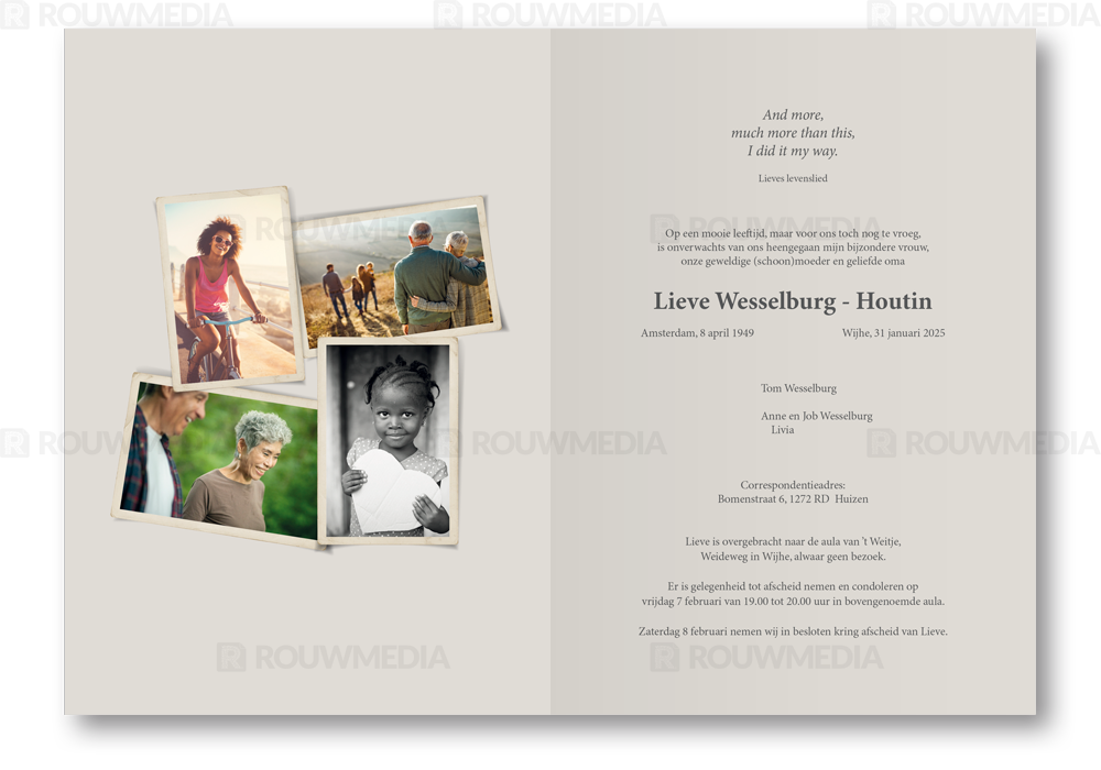 Op deze rouwkaart kunt u een eigen foto plaatsen in een nostalgisch verkleurd fotoframe. Aan de binnenzijde kunt u meerdere foto