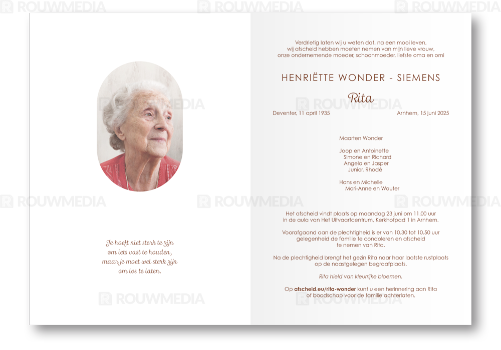 Op deze rouwkaart wordt een eigen foto weergegeven in de vorm van een deens ovaal