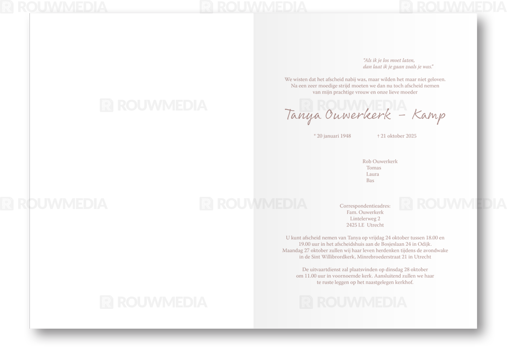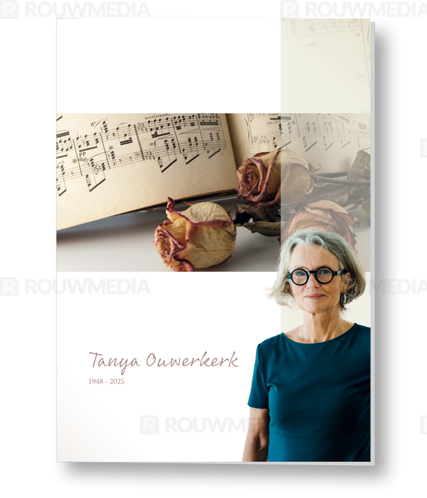 Op deze rouwkaart wordt bladmuziek weergegeven op de achtergrond met een roos ervoor, op de voorgrond is er plaats voor een eigen foto.