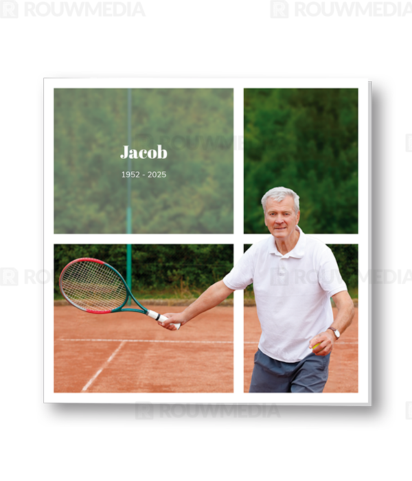 Op deze rouwkaart kunt u een eigen foto plaatsen en worden hieromheen witte kaders geplaatst om de foto extra te benadrukken. Aan de binnenzijde kan een element terugkomen.