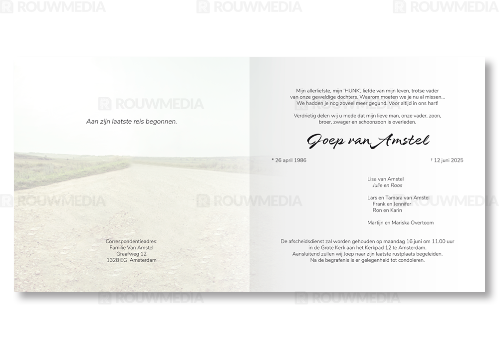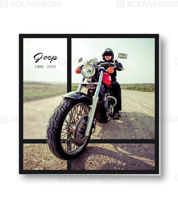 Op deze rouwkaart kunt u een eigen foto plaatsen en worden hieromheen stoere zwarte kaders geplaatst om de foto extra te benadrukken. Aan de binnenzijde kan een element terugkomen.