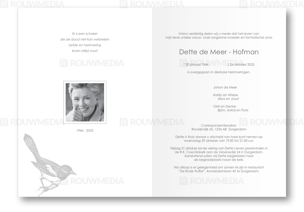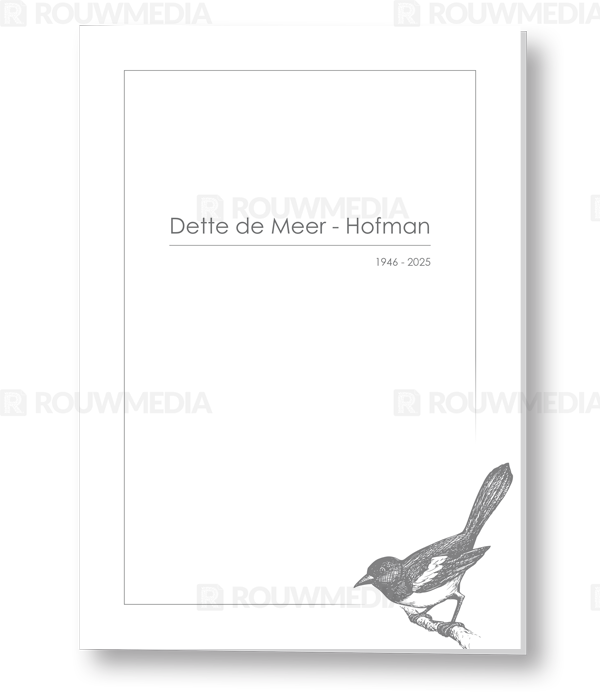 Deze rouwkaart toont in een simpele stijl hoe een afbeelding de focus kan krijgen in een kaart, maar wel de serene rust bewaart. Voor deze kaart is er gekozen voor geïllustreerde ekster op een tak.