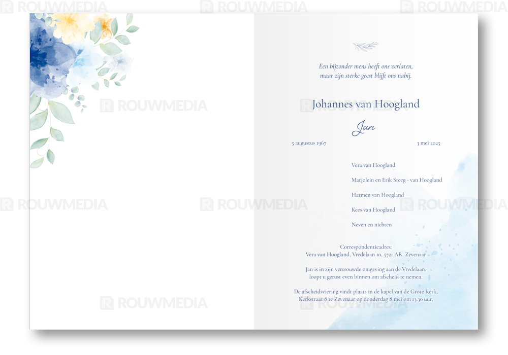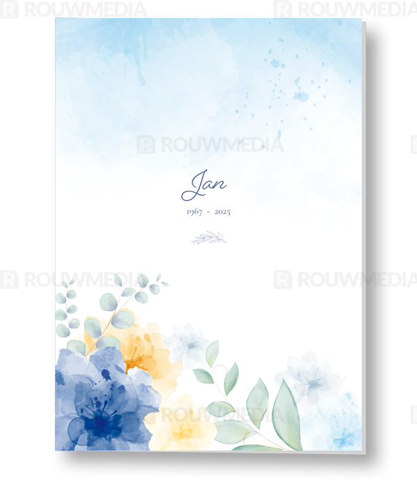 In deze recht staande kaart wordt een getekende eucalyptus tak en bloemen weergegeven in blauwe tint. Daarnaast is het mogelijk om de naam, data en gedicht/citaat weer te geven.
