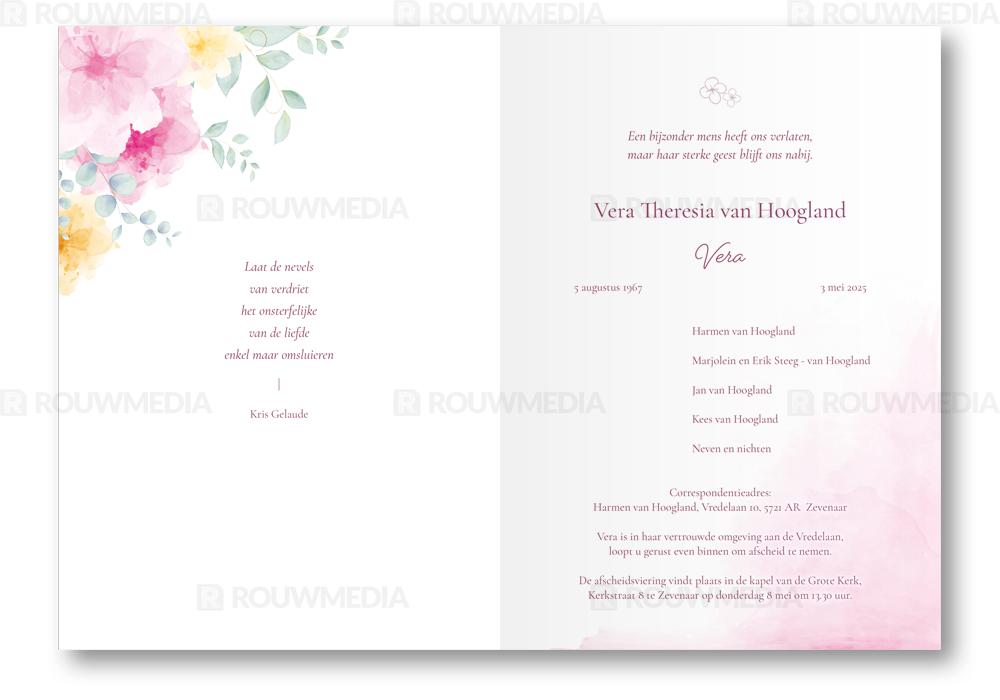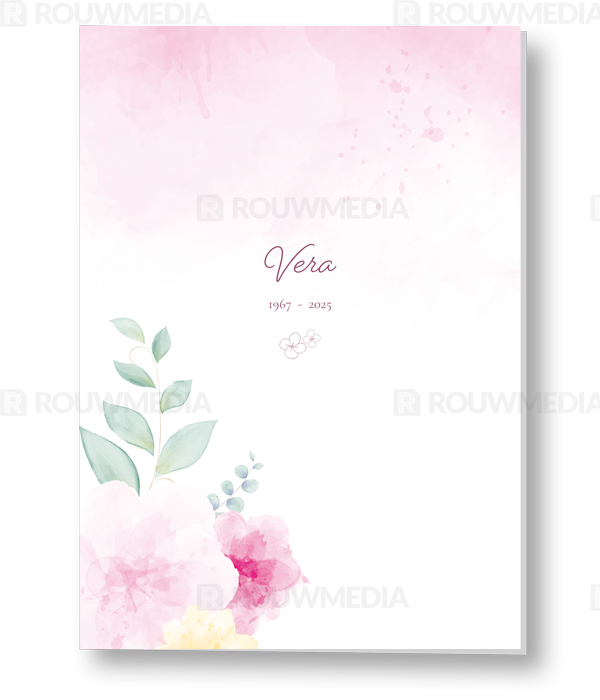 In deze recht staande kaart wordt een getekende eucalyptus tak en bloemen weergegeven. Daarnaast is het mogelijk om de naam, data en gedicht/citaat weer te geven.