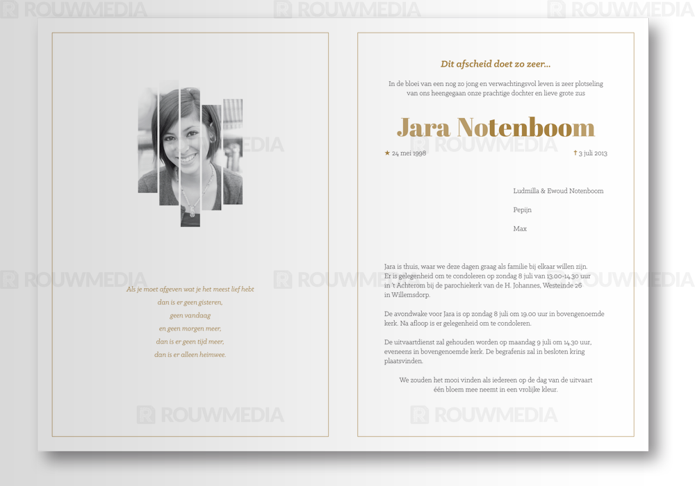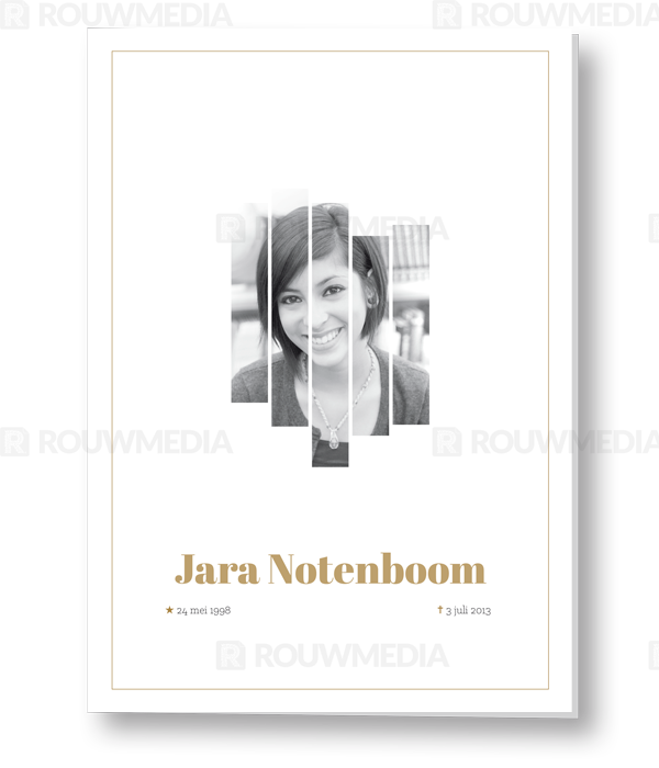 Rouwkaart met een eigen portret die in strepen weergeven wordt. De foto komt terug aan de binnenkant