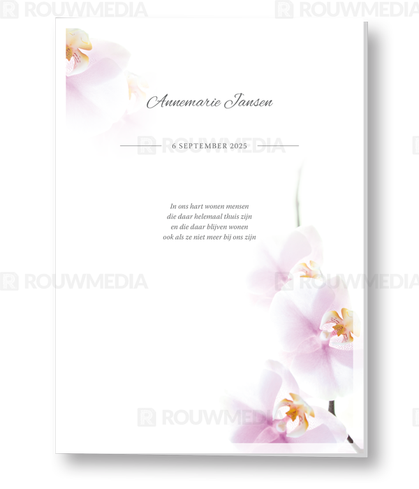 In deze staande rouwkaart wordt een beeldvullende afbeelding weergegeven van een witte orchidee. Daarnaast is het mogelijk om de naam, datums en gedicht/citaat weer te geven.