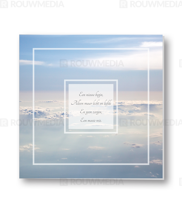 In deze vierkante rouwkaart wordt een beeldvullende afbeelding weergegeven van wolken. Daarnaast is het mogelijk om een gedicht/citaat weer te geven.