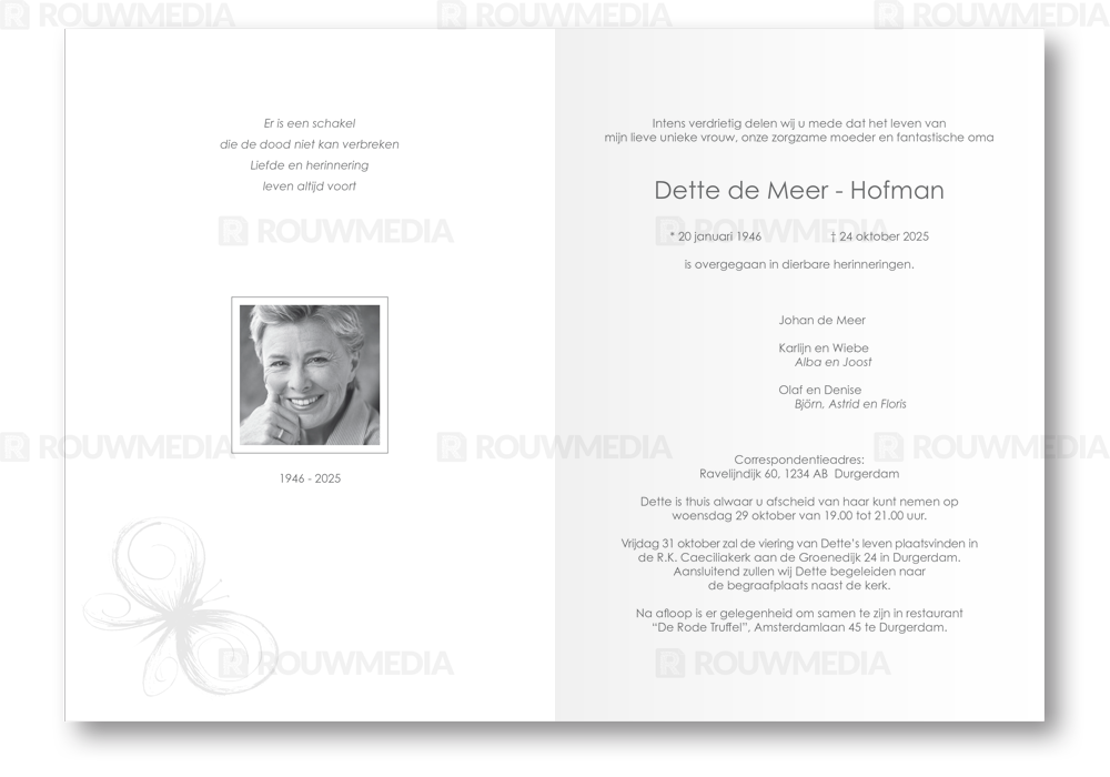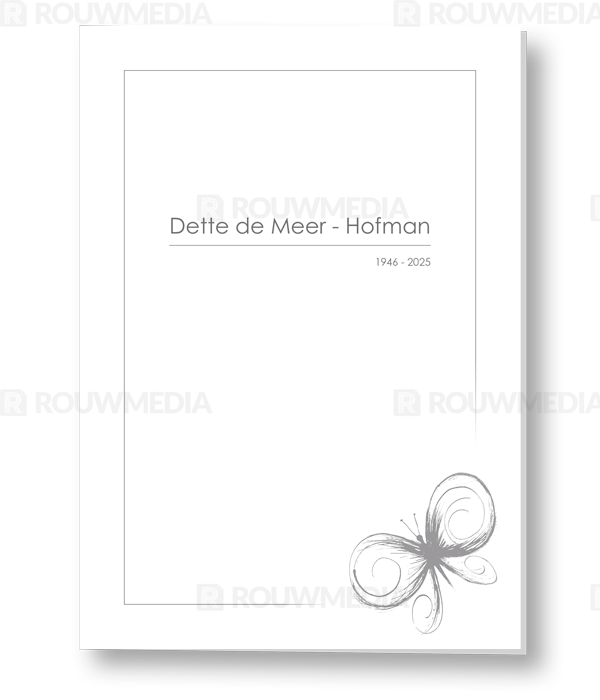 Deze rouwkaart toont in een simpele stijl hoe een afbeelding de focus kan krijgen in een kaart, maar wel de serene rust bewaart. Voor deze kaart is er gekozen voor geïllustreerde vlindertje.