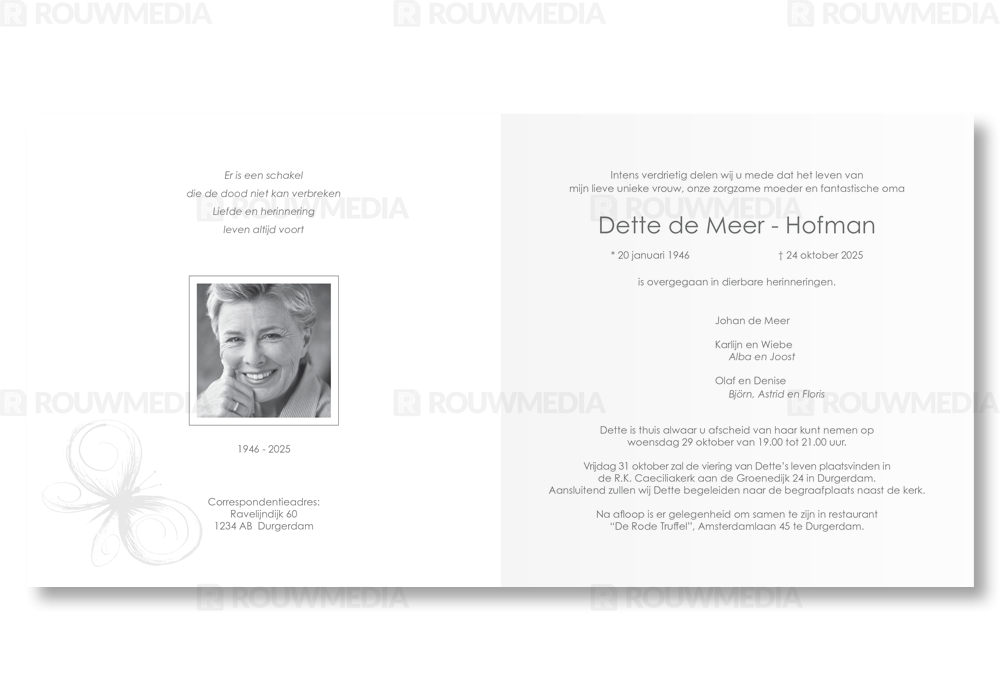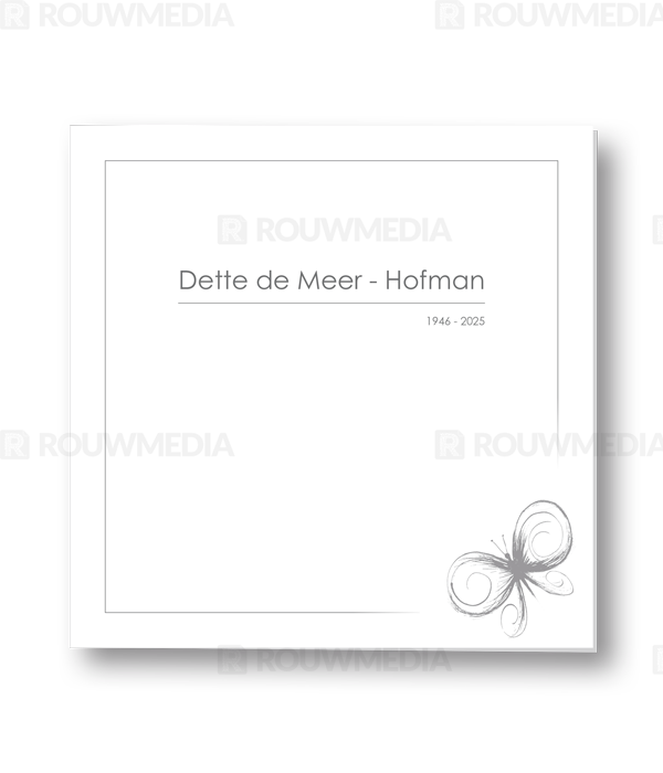 Deze vierkante rouwkaart toont in een simpele stijl hoe een afbeelding de focus kan krijgen in een kaart, maar wel de serene rust bewaart. Voor deze kaart is er gekozen voor geïllustreerde vlindertje.