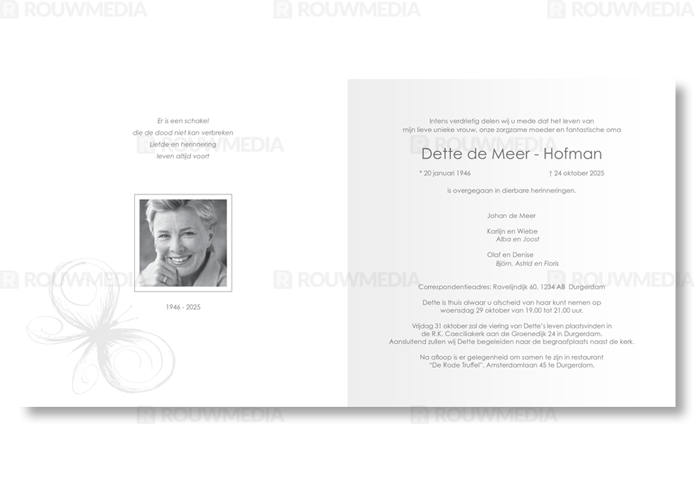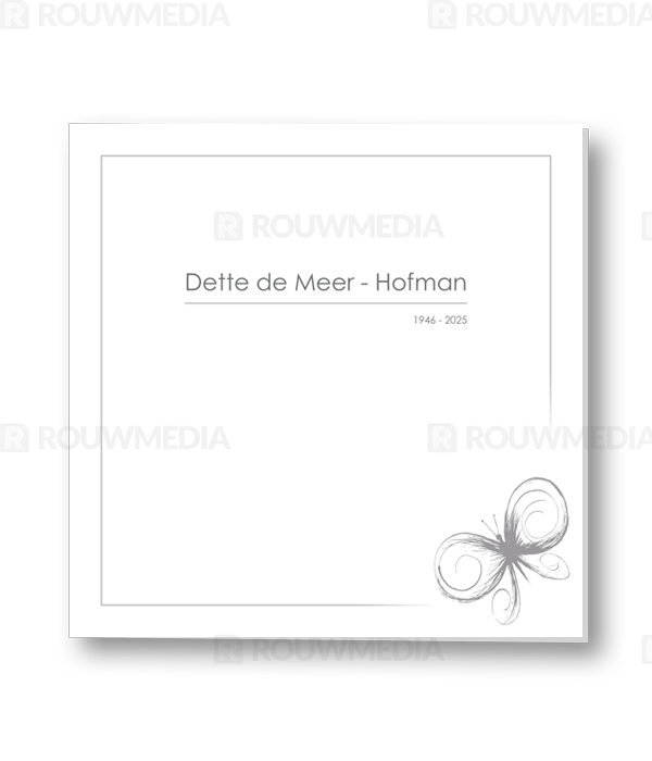 Deze vierkante rouwkaart toont in een simpele stijl hoe een afbeelding de focus kan krijgen in een kaart, maar wel de serene rust bewaart. Voor deze kaart is er gekozen voor geïllustreerde vlindertje.