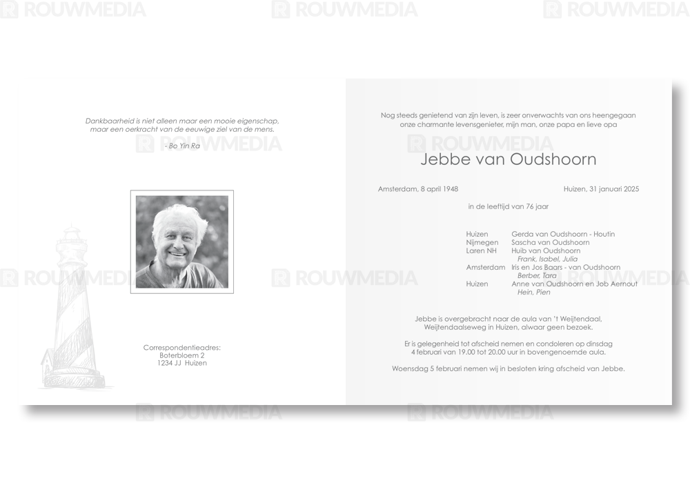 Rouwkaart met geillustreerde vuurtoren