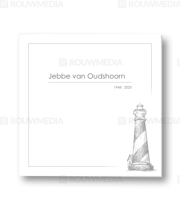 Deze vierkante rouwkaart toont in een simpele stijl hoe een afbeelding de focus kan krijgen in een kaart, maar wel de serene rust bewaart. Voor deze kaart is er gekozen voor een geïllustreerde vuurtoren.