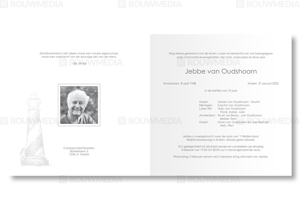 Deze vierkante rouwkaart toont in een simpele stijl hoe een afbeelding de focus kan krijgen in een kaart, maar wel de serene rust bewaart. Voor deze kaart is er gekozen voor een geïllustreerde vuurtoren.