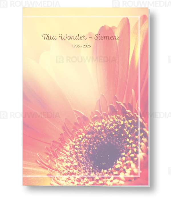 In de staande rouwkaart wordt een beeldvullende foto weergegeven van een oranje gerbera.