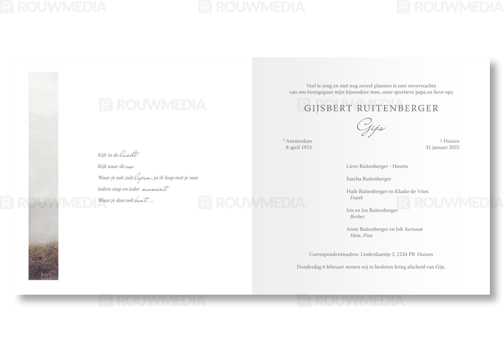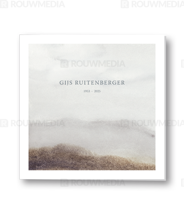 In deze vierkante rouwkaart is een geschilderd landschap gebruikt. De focus binnen deze kaart ligt op de geschilderde/aquarel stijl. Daarnaast is het ook mogelijk om de naam en datums weer te geven.