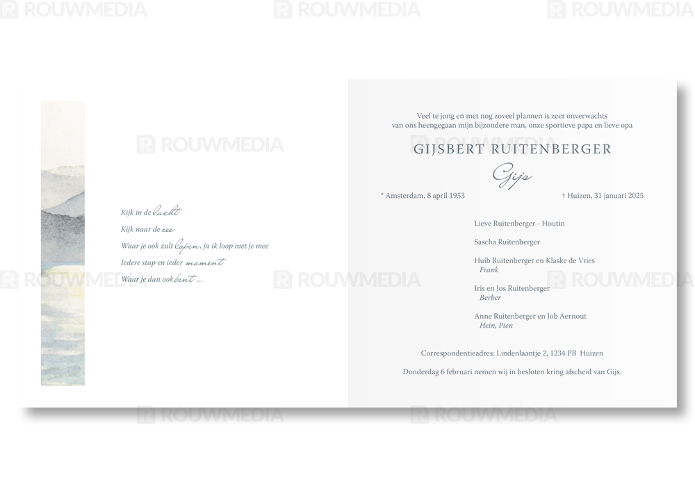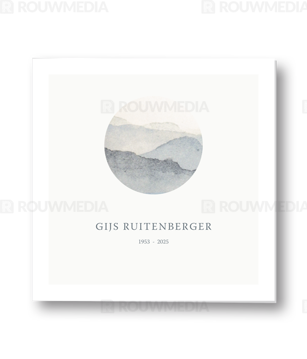 In deze vierkante rouwkaart zijn geschilderde bergen in een cirkel weergegeven. De focus binnen deze kaart ligt op de geschilderde/aquarel stijl. Daarnaast is het ook mogelijk om de naam en datums te tonen.