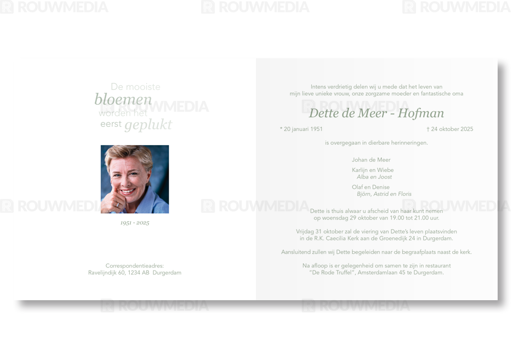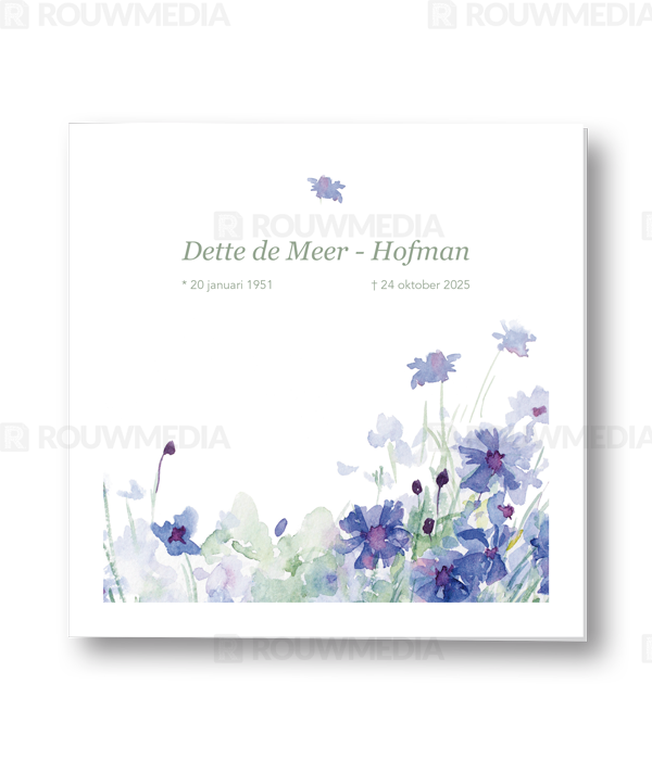 In deze vierkante rouwkaart is een geschilderd bloementafereel gebruikt. De focus binnen deze kaart ligt op de geschilderde/aquarel stijl. Daarnaast is het ook mogelijk om de naam en datums weer te geven.