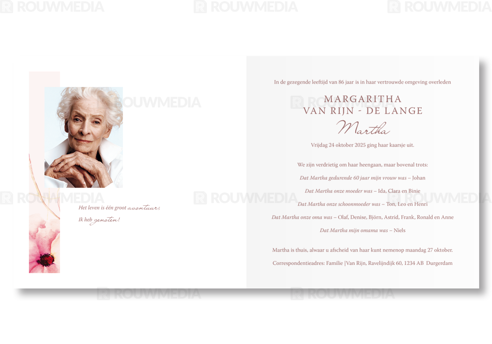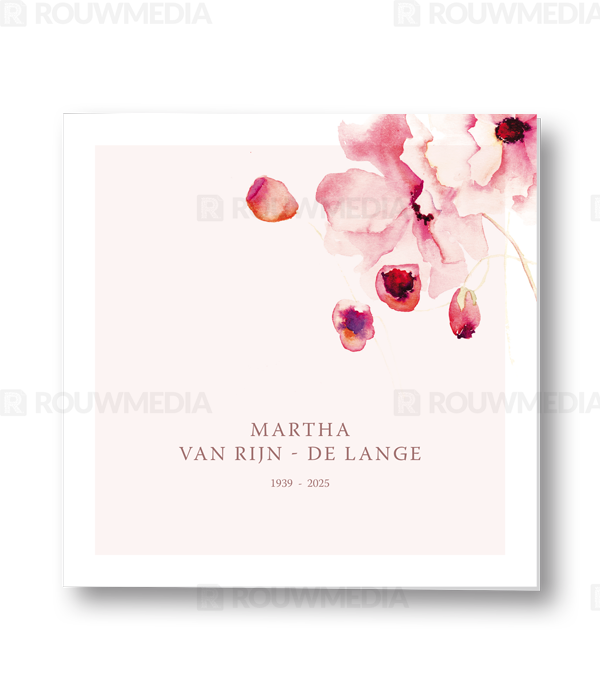 In deze vierkante rouwkaart zijn geschilderde bloemen weergegeven. De focus binnen deze kaart ligt op de geschilderde/aquarel stijl. Daarnaast is het ook mogelijk om de naam en datums te tonen.