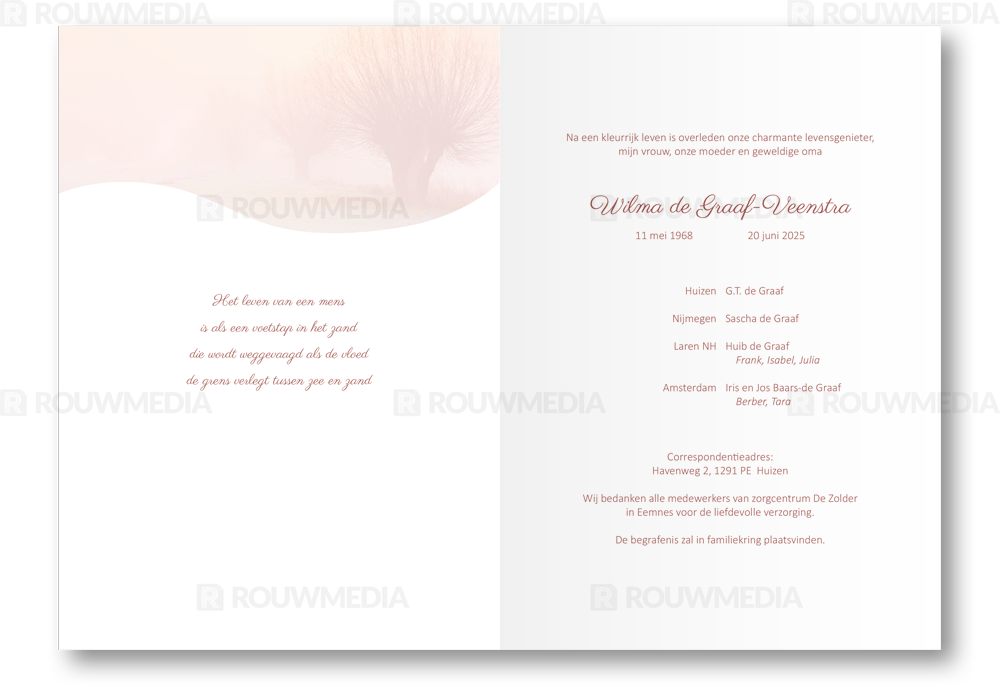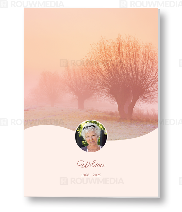 In deze staande rouwkaart wordt een beeldvullende afbeelding weergegeven van knotwilgen in de vroege ochtend. Onder de afbeelding kunt u de naam en datums weergeven.