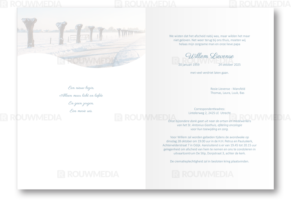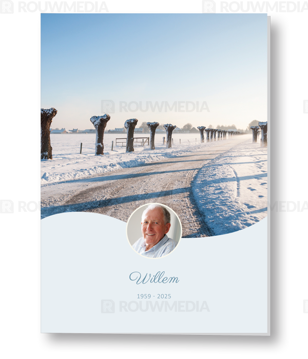 In deze staande rouwkaart wordt een beeldvullende afbeelding weergegeven van knotwilgen in de sneeuw. Onder de afbeelding kunt u de naam en datums weergeven.
