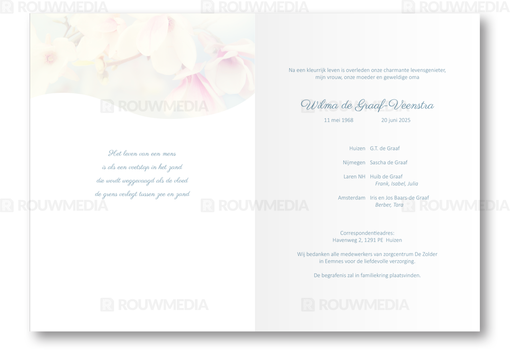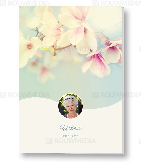 In deze staande rouwkaart wordt een beeldvullende afbeelding weergegeven van witte en roze magnolia