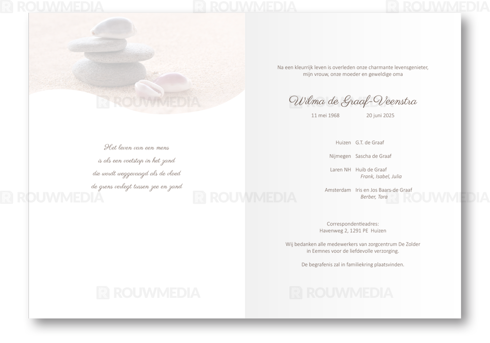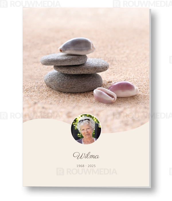 In deze staande rouwkaart wordt een beeldvullende afbeelding weergegeven van opgestapelde stenen op het zand. Onder de afbeelding kunt u de naam en datums weergeven.