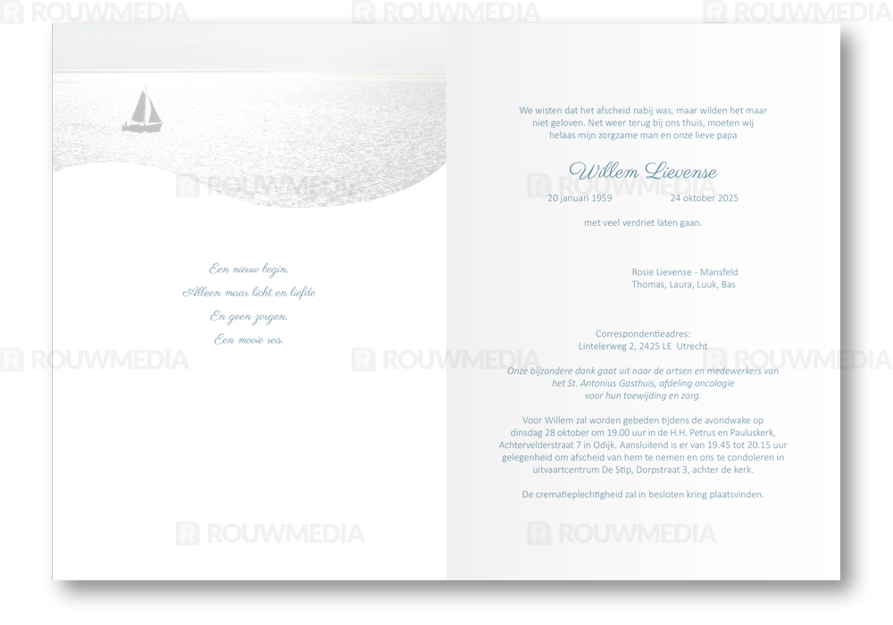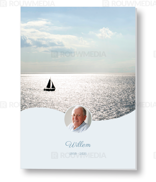 In deze staande rouwkaart wordt een beeldvullende afbeelding weergegeven van een zeilboot op zee. Onder de afbeelding kunt u de naam en datums weergeven.