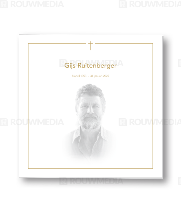 Rouwkaart met goud kader en kruis boven gecentreerd. Naam kan boven in de Rouwkaart geplaatst worden. Er is ruimte voor een portret of andere eigen afbeelding.