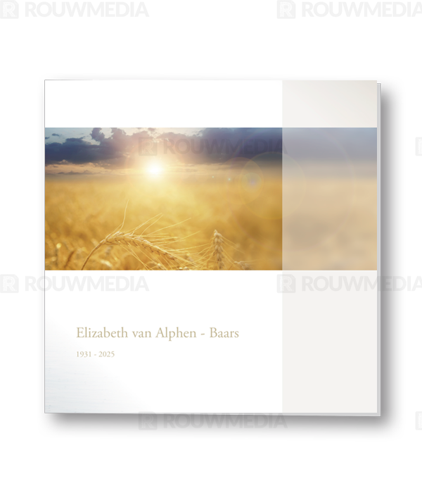 Rouwkaart met afbeelding van een veld vol graan of koren. Aan de rechterkant wordt een transparante balk weergegeven om de kaart wat meer kleur te geven en speelser te maken.