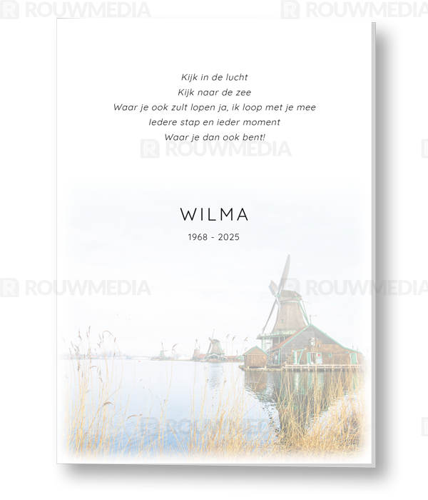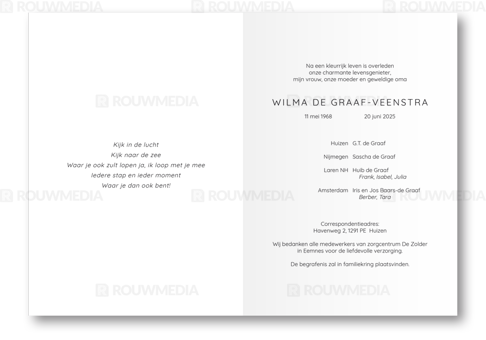 Deze staande rouwkaart heeft een beeldvullende afbeelding van een hart in de wolken op de voorkant weergegeven. Onder de afbeelding is het mogelijkheid om een naam met datums weer te geven.