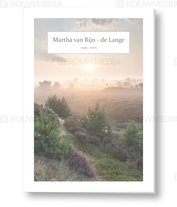 In de staande rouwkaart wordt een beeldvullende foto weergegeven van heidelandschap.