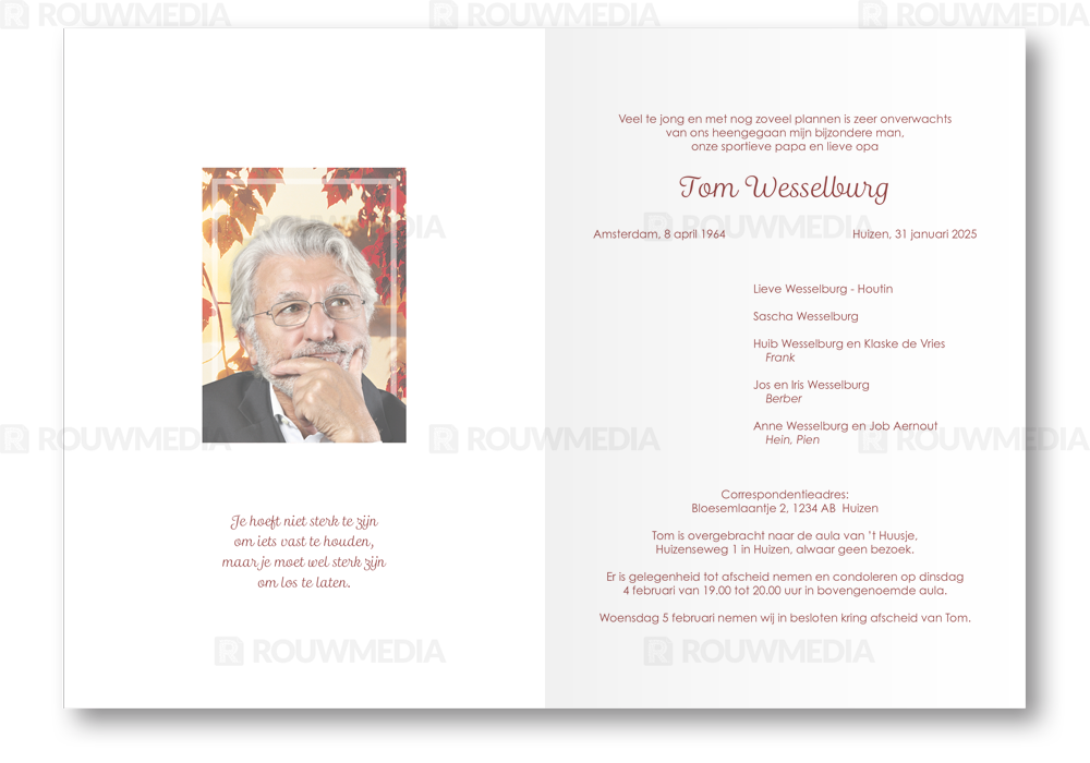 In de staande rouwkaart wordt een beeldvullende foto weergegeven van herfstbladeren in de zon.