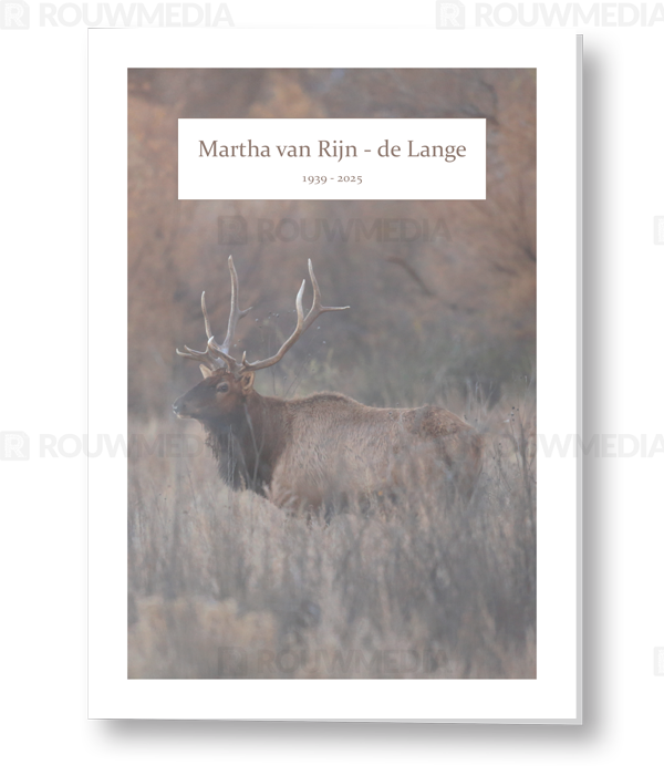 In de staande rouwkaart wordt een beeldvullende foto weergegeven van een hert in de struiken.