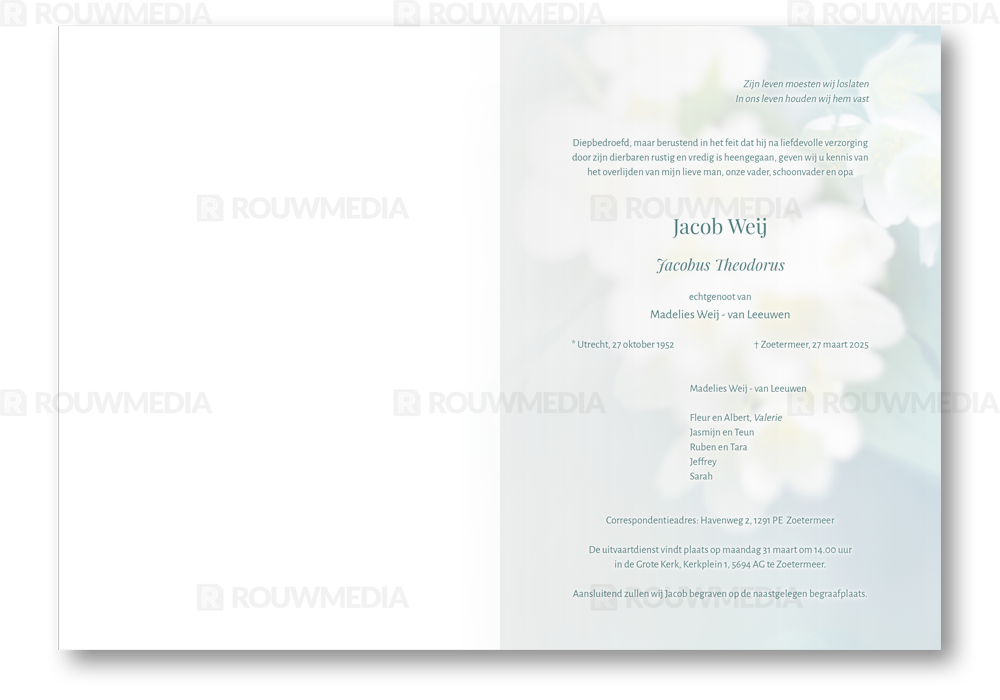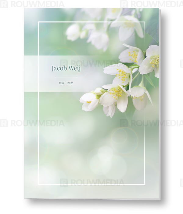 In deze recht staande kaart wordt een afbeelding weergegeven een afbeelding van een jasmijn bloem. Daarnaast is het mogelijk om de naam, data en gedicht/citaat weer te geven.