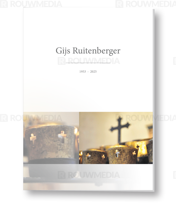 Op deze staande rouwkaart wordt een kaarsje in een kerk met kruis op de achtergrond weergegeven. Daarboven is het mogelijk om een naam met datums weer te geven.