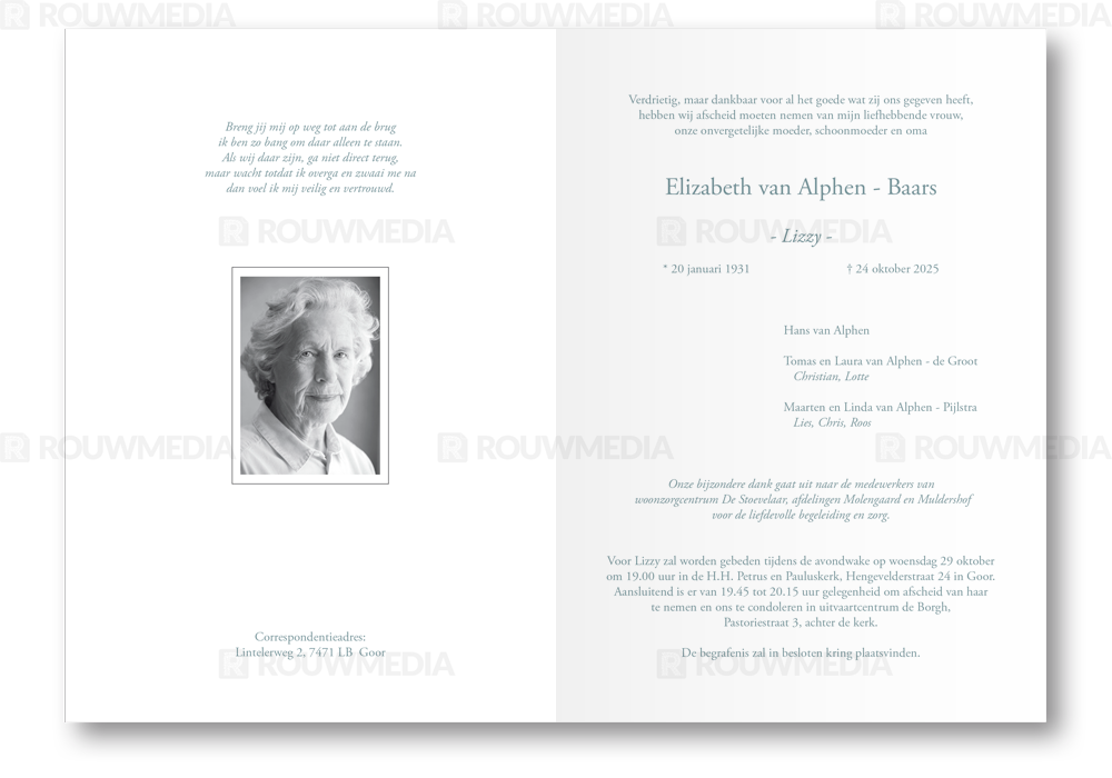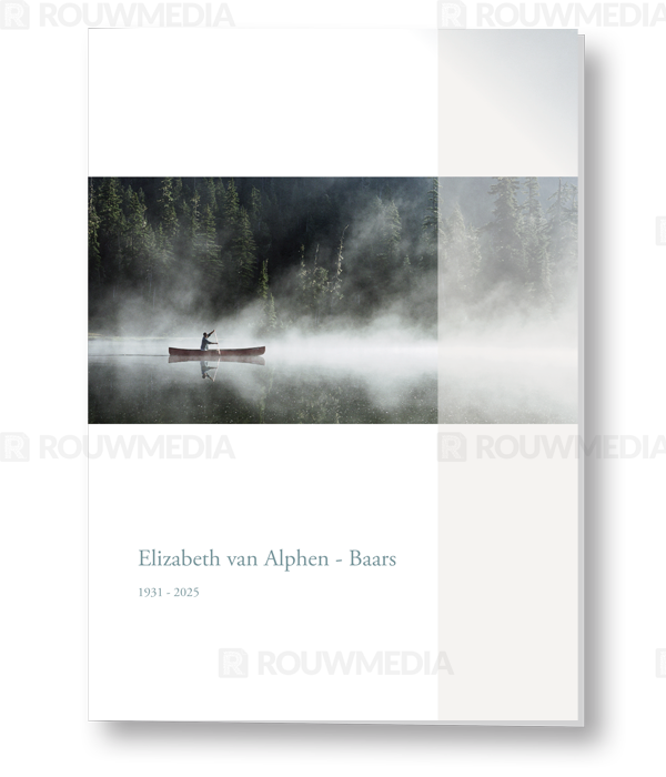 Rouwkaart met afbeelding van een peddelaar in een kano over een mistig meer. Aan de rechterkant wordt een transparante balk weergegeven om de kaart wat meer kleur te geven en speelser te maken.