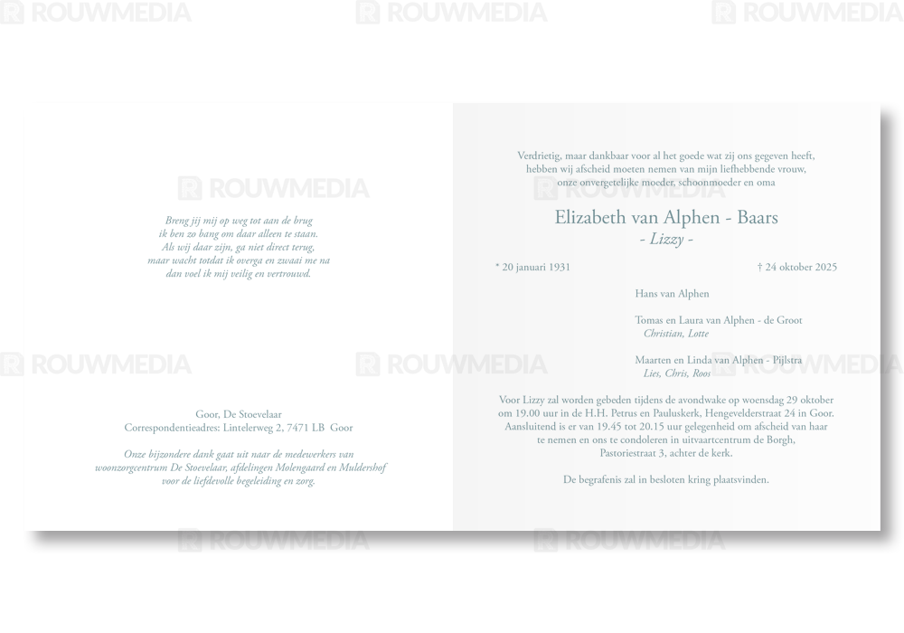 Rouwkaart met afbeelding van een peddelaar in een kano over een mistig meer. Aan de rechterkant wordt een transparante balk weergegeven om de kaart wat meer kleur te geven en speelser te maken.