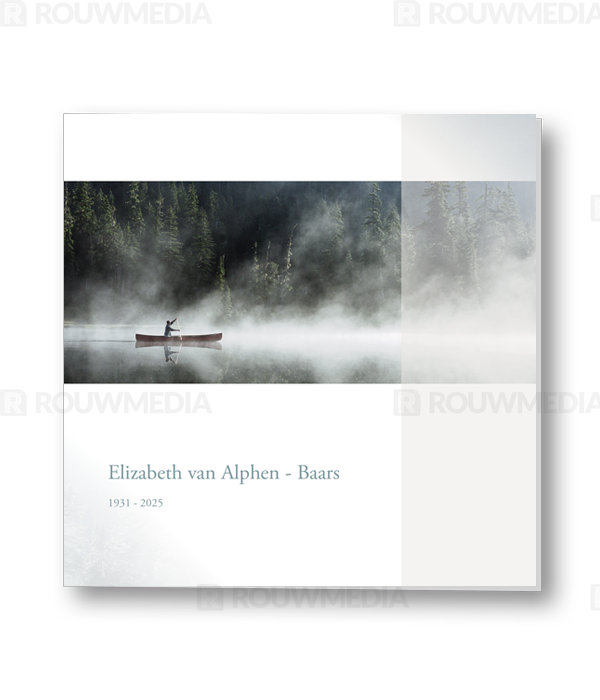 Rouwkaart met afbeelding van een peddelaar in een kano over een mistig meer. Aan de rechterkant wordt een transparante balk weergegeven om de kaart wat meer kleur te geven en speelser te maken.