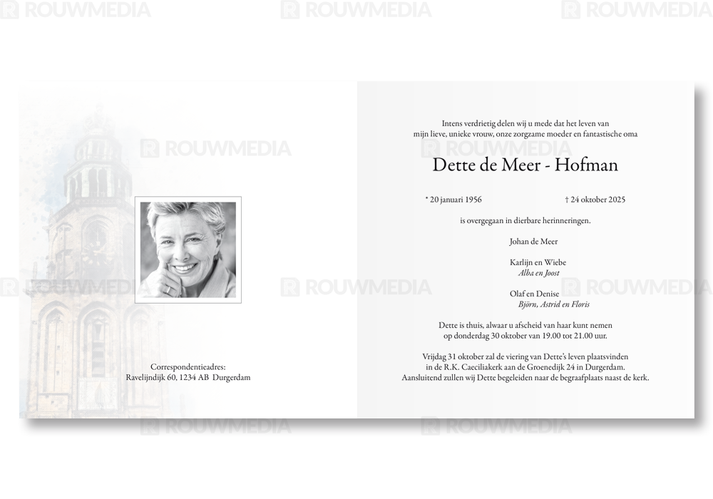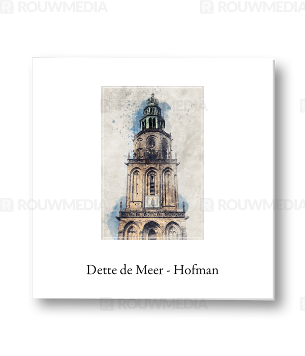 Op deze kaart wordt een kerktoren weergegeven. Onder de schets kan de naam en datums worden getoond.