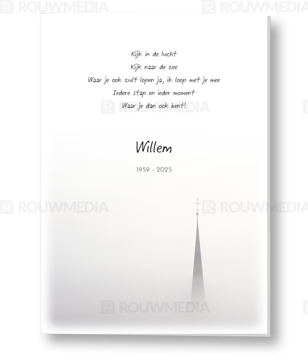 In deze staande rouwkaart wordt een beeldvullende afbeelding weergegeven van een kerktoren in de mist. Onder de afbeelding kunt u de naam en datums weergeven.
