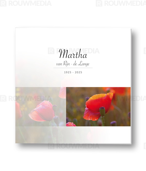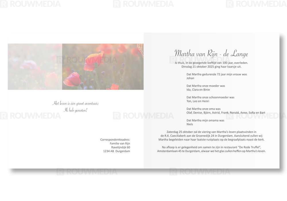 Op deze staande rouwkaart wordt een klaproos weergegeven. Daarboven is het mogelijk om een naam met datums weer te geven.