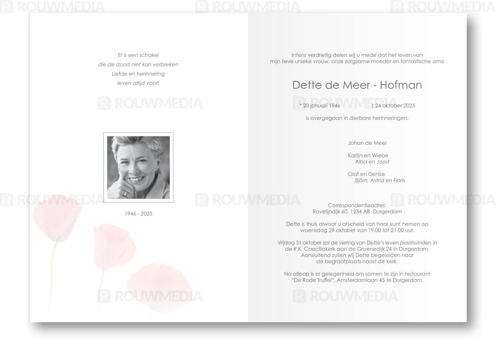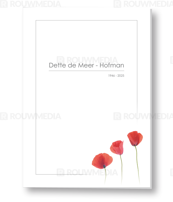Deze rouwkaart toont in een simpele stijl hoe een afbeelding van klaprozen de focus kan krijgen in een kaart, maar wel de serene rust bewaart.
