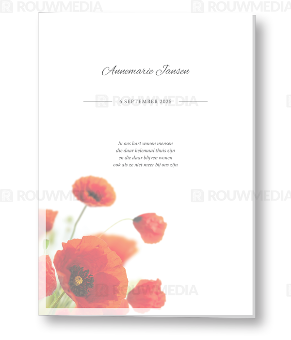 In deze staande rouwkaart wordt een beeldvullende afbeelding weergegeven van klaprozen. Daarnaast is het mogelijk om de naam, datums en gedicht/citaat weer te geven.