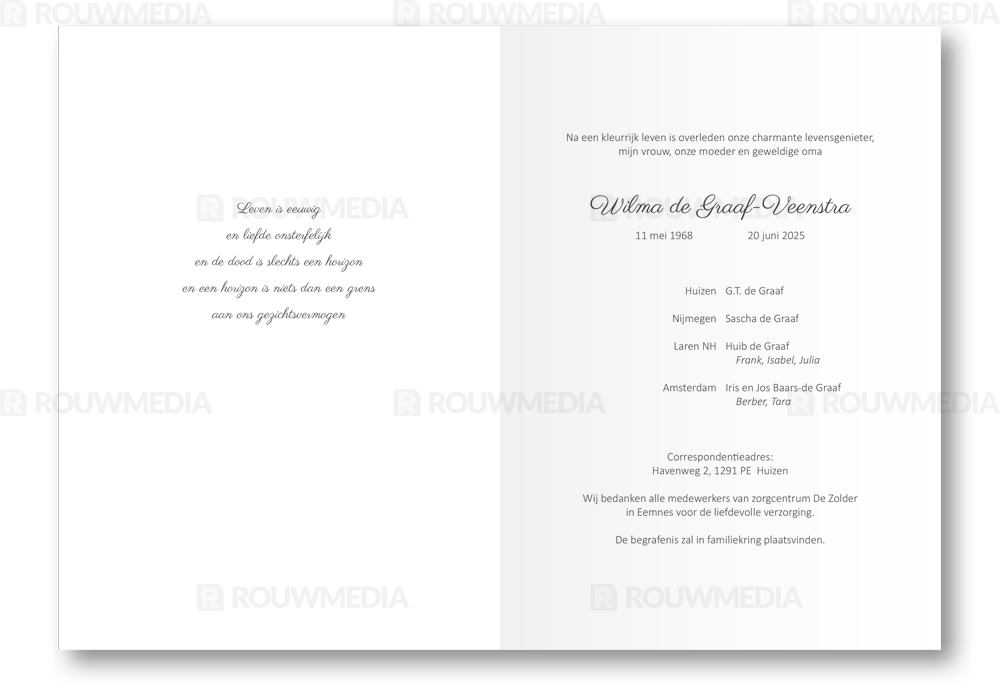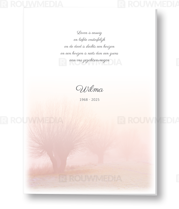 In deze staande rouwkaart wordt een beeldvullende afbeelding weergegeven van knotwilgen in de vroege ochtend. Onder de afbeelding kunt u de naam en datums weergeven.